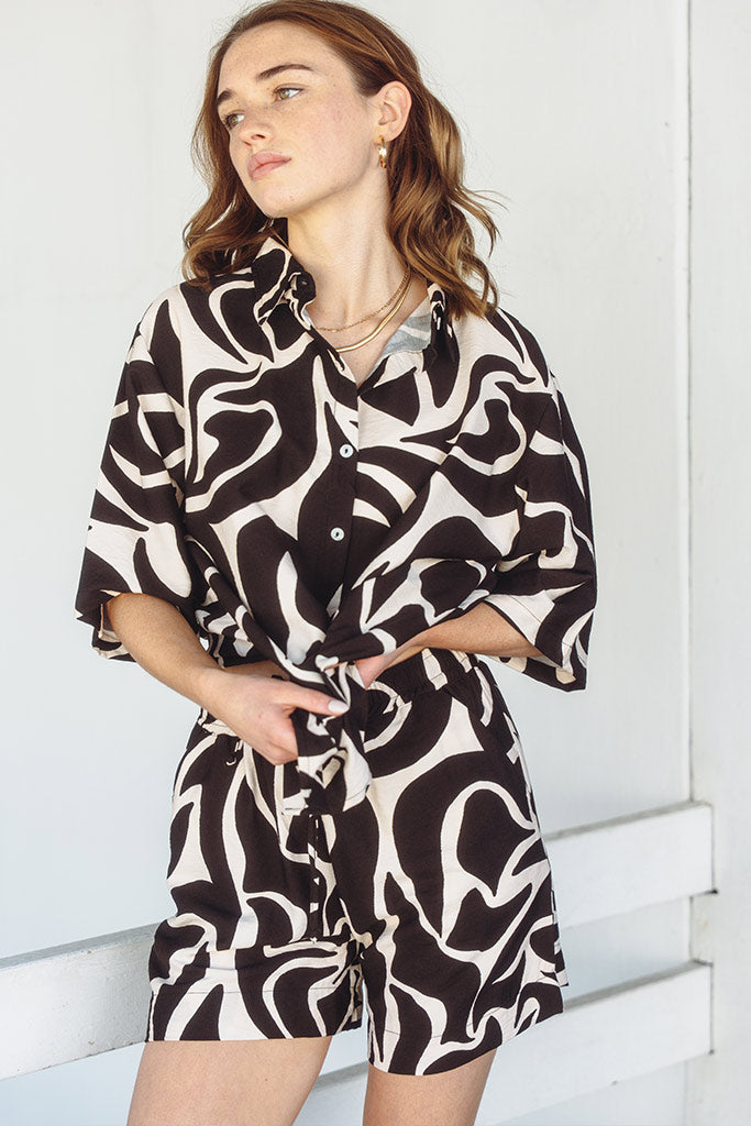 Brady Drawstring Shorts Cotton - Black & Cream Print